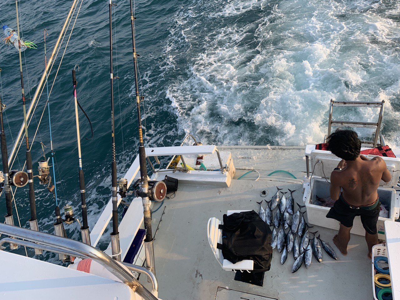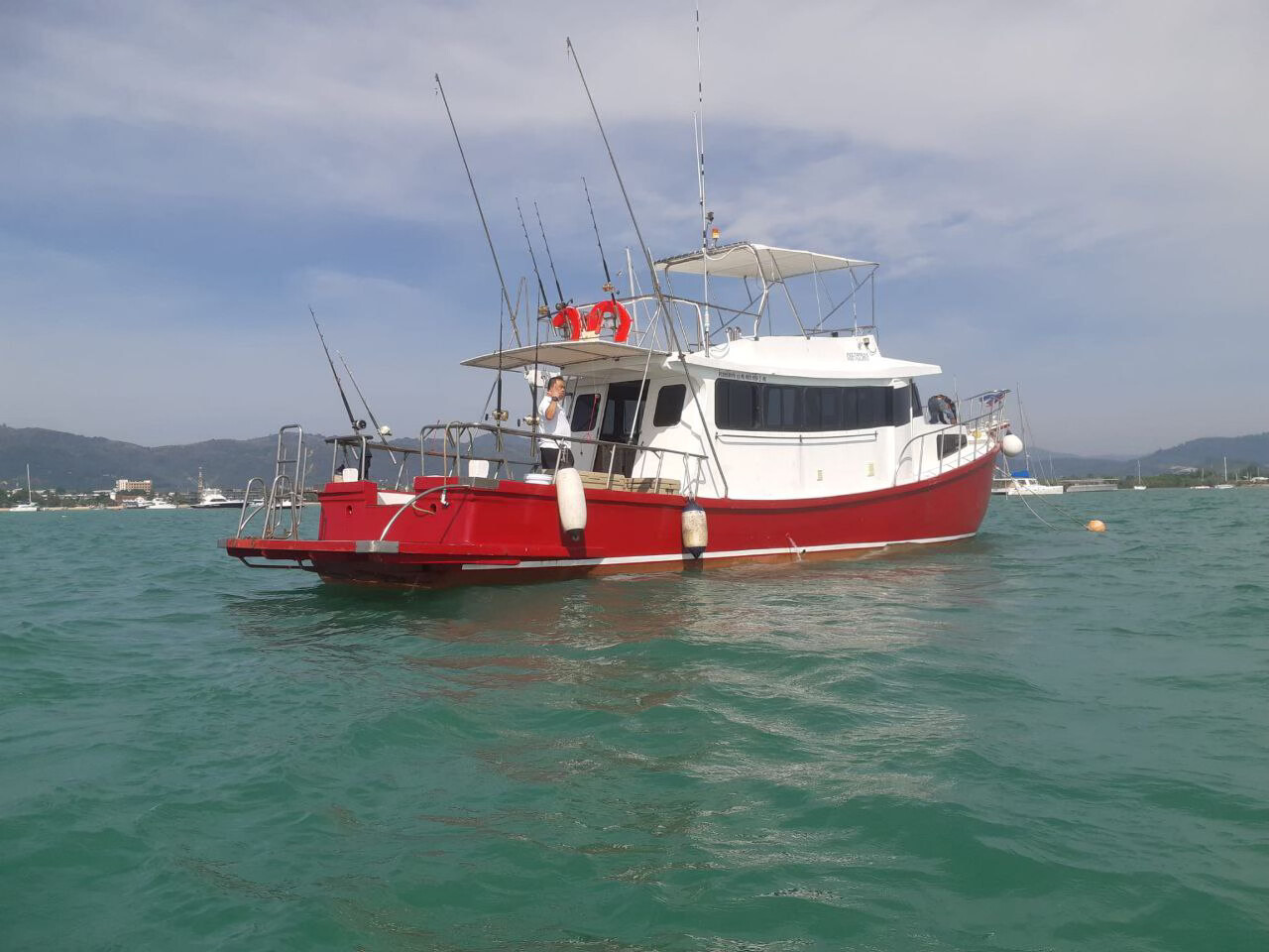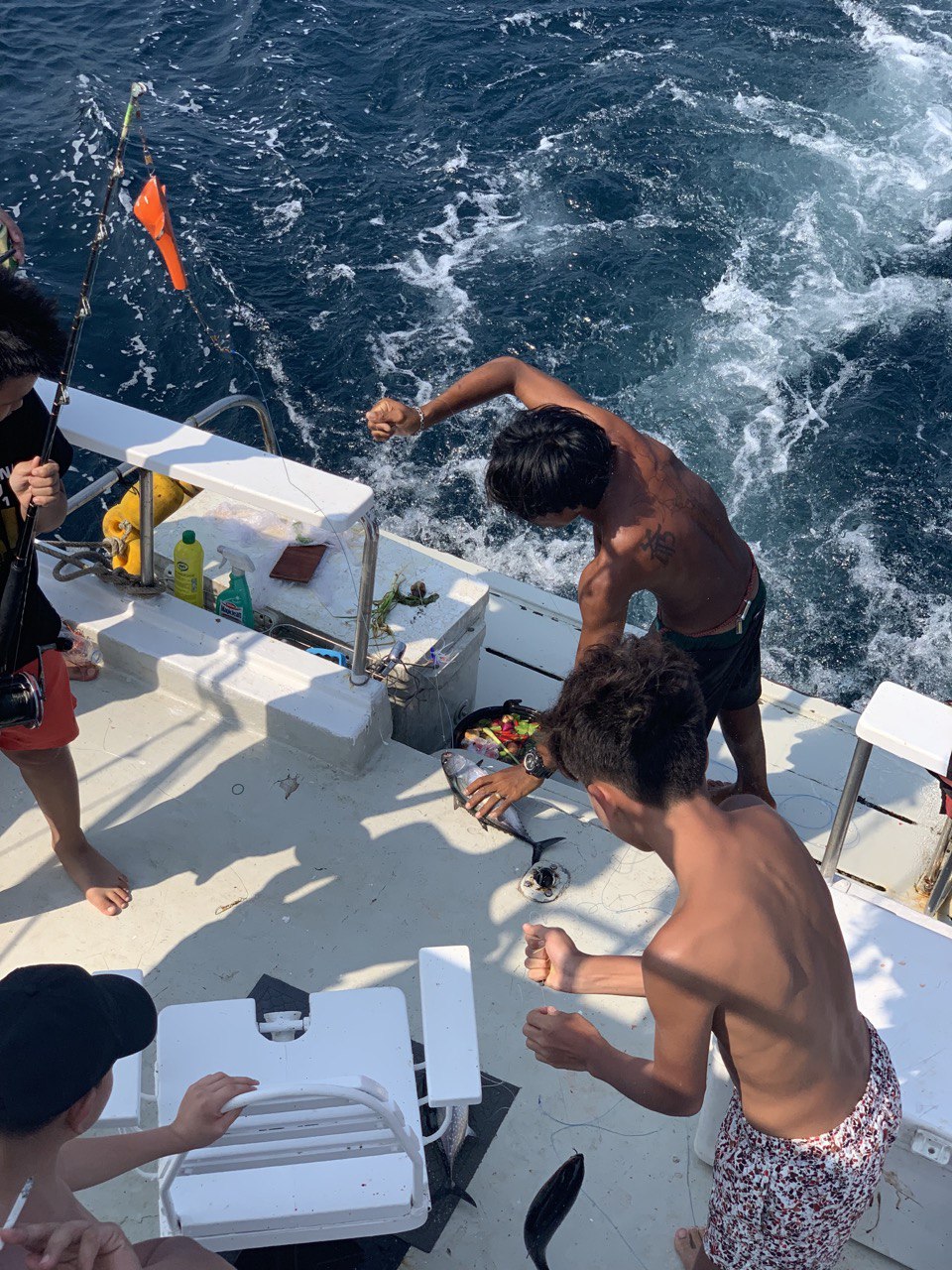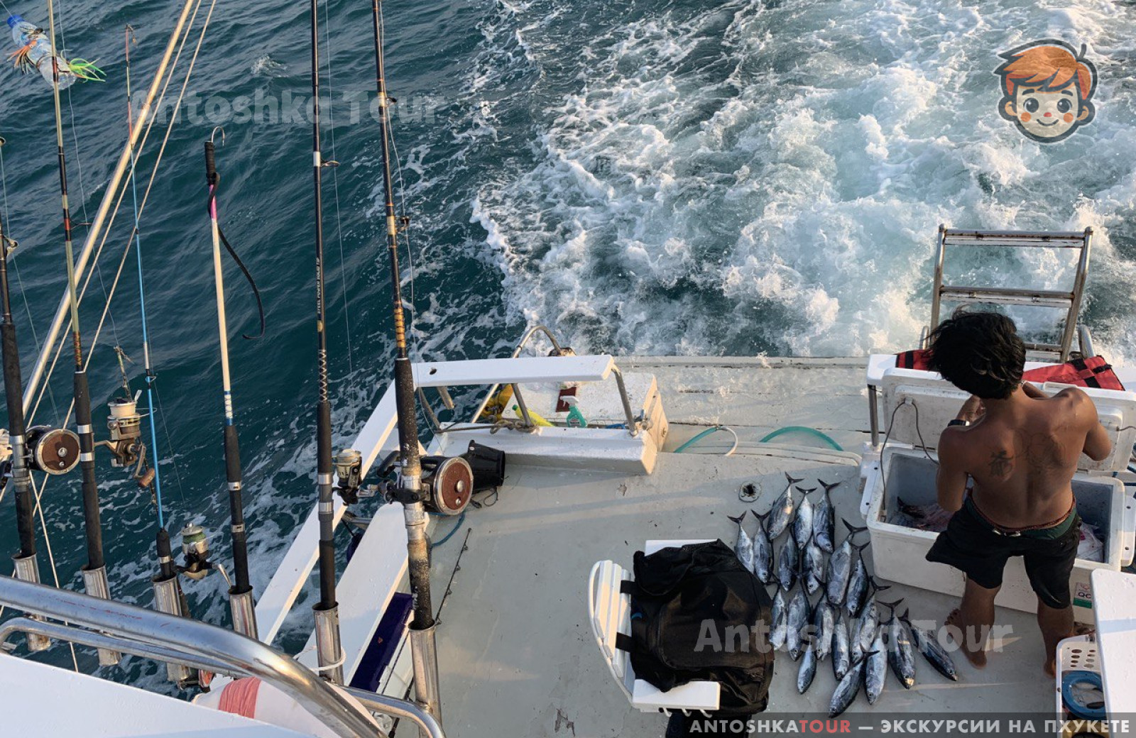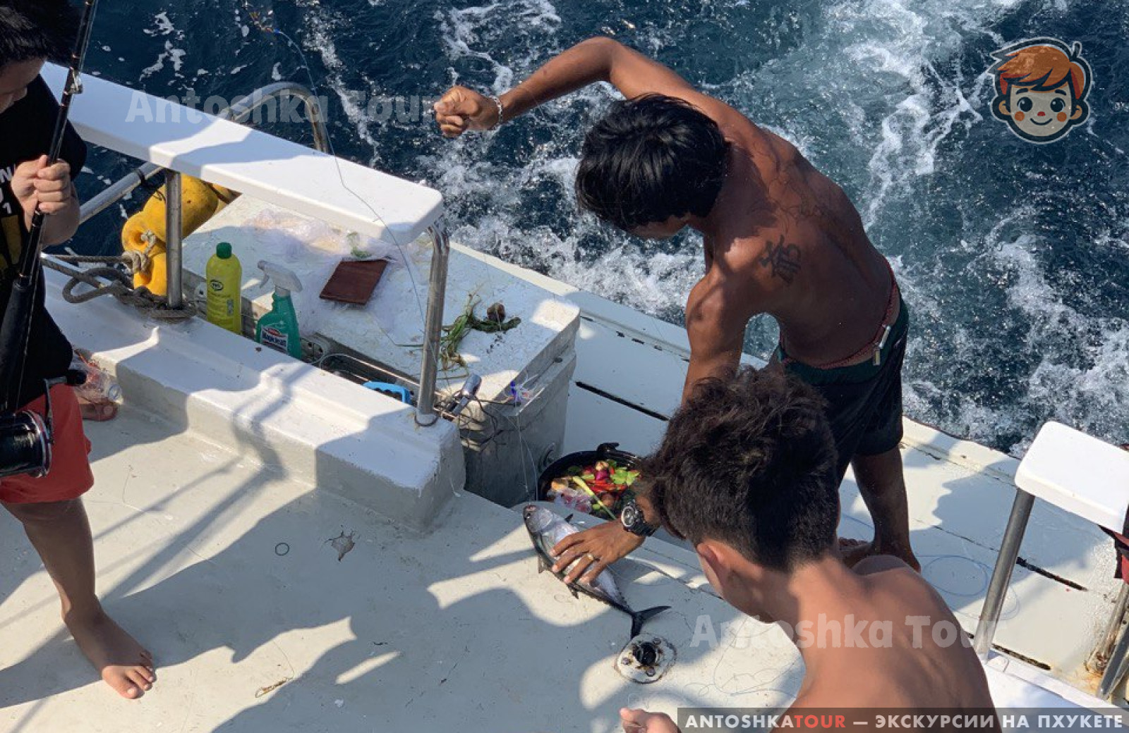 | Отправление с пристани Чалонг и начало троллинга по пути на остров Рача. Сразу после выхода в море, тайский персонал раскладывает удочки и бросает 6 лесок на полном ходу для троллинга. В это время вы можете расслабиться, загорать и следить за уловом. Вы также можете наслаждаться напитками, общением и веселым времяпрепровождением с другими участниками. Когда рыба попадается на крючок, каждому рыбаку по очереди предлагают вытащить её. | |