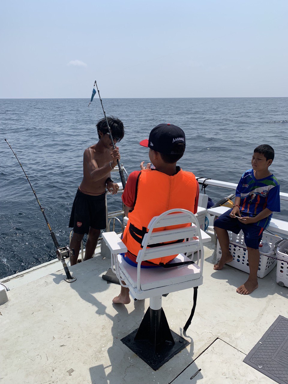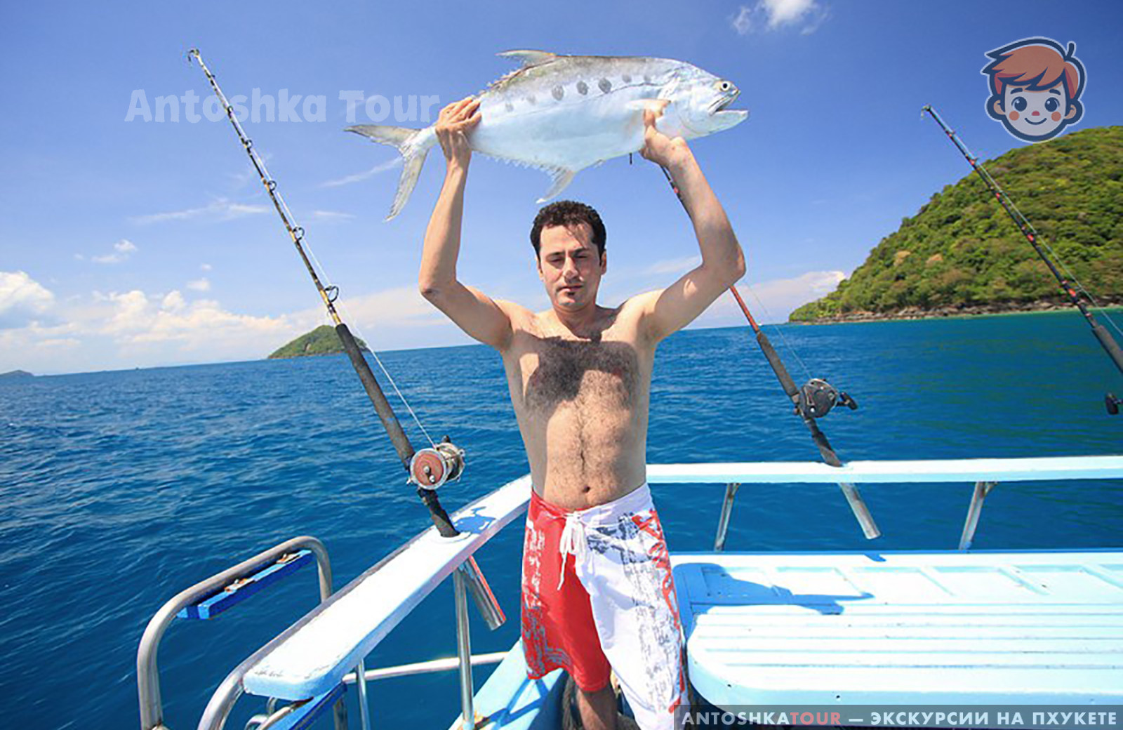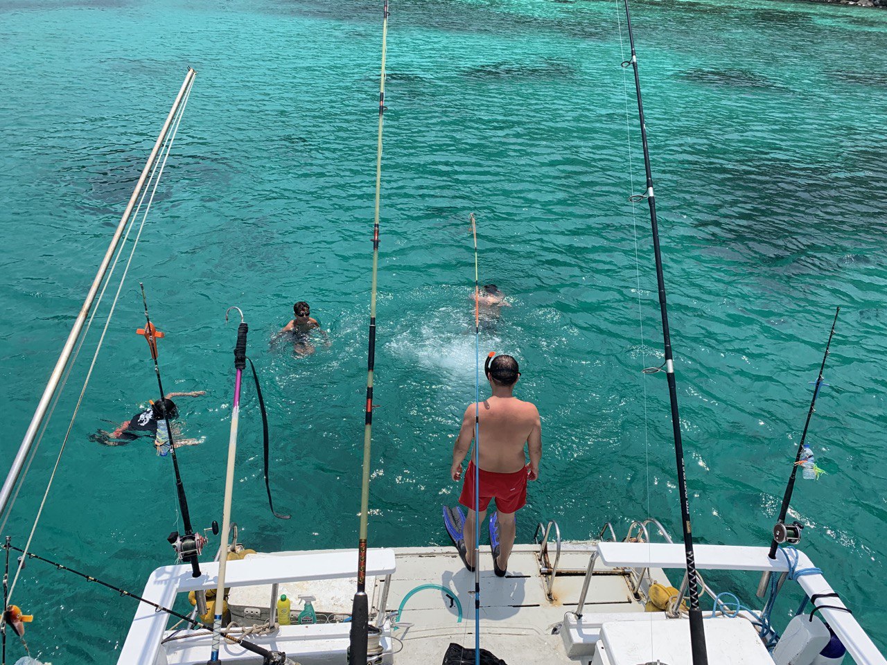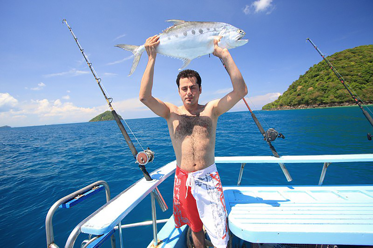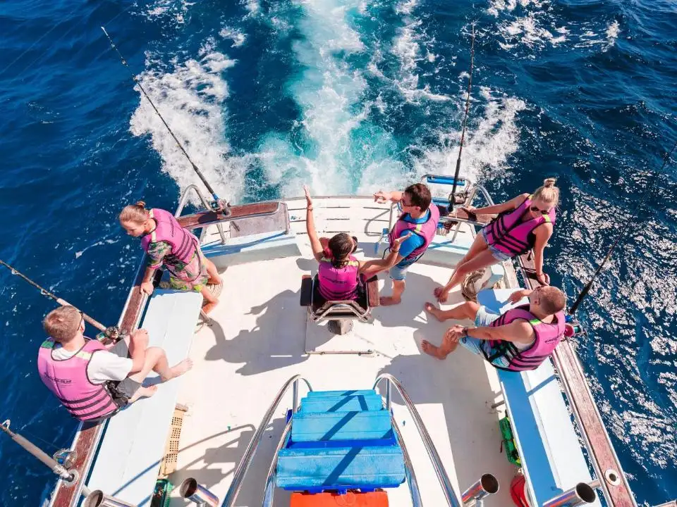 | Отправление с пристани Чалонг и начало троллинга по пути на остров Рача. Сразу после выхода в море, тайский персонал раскладывает удочки и бросает 6 лесок на полном ходу для троллинга. В это время вы можете расслабиться, загорать и следить за уловом. Вы также можете наслаждаться напитками, общением и веселым времяпрепровождением с другими участниками. Когда рыба попадается на крючок, каждому рыбаку по очереди предлагают вытащить её. | |